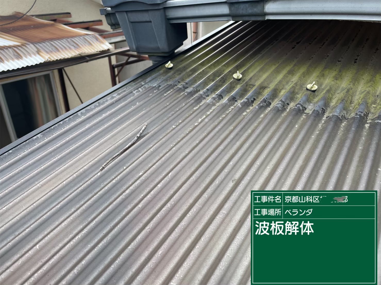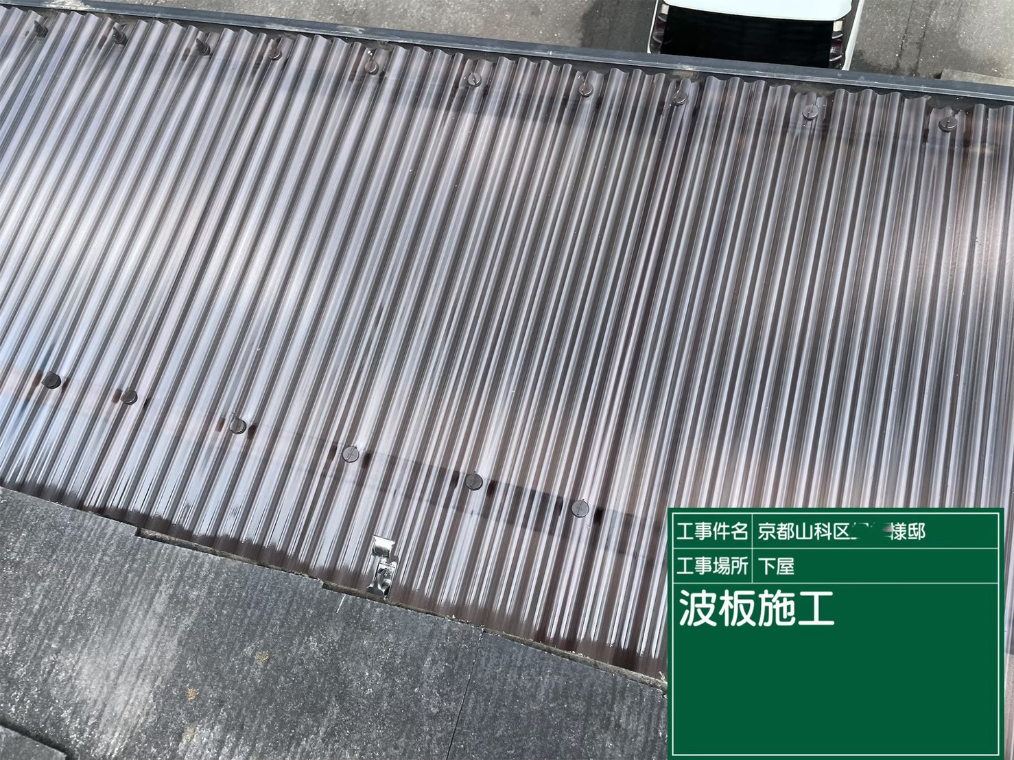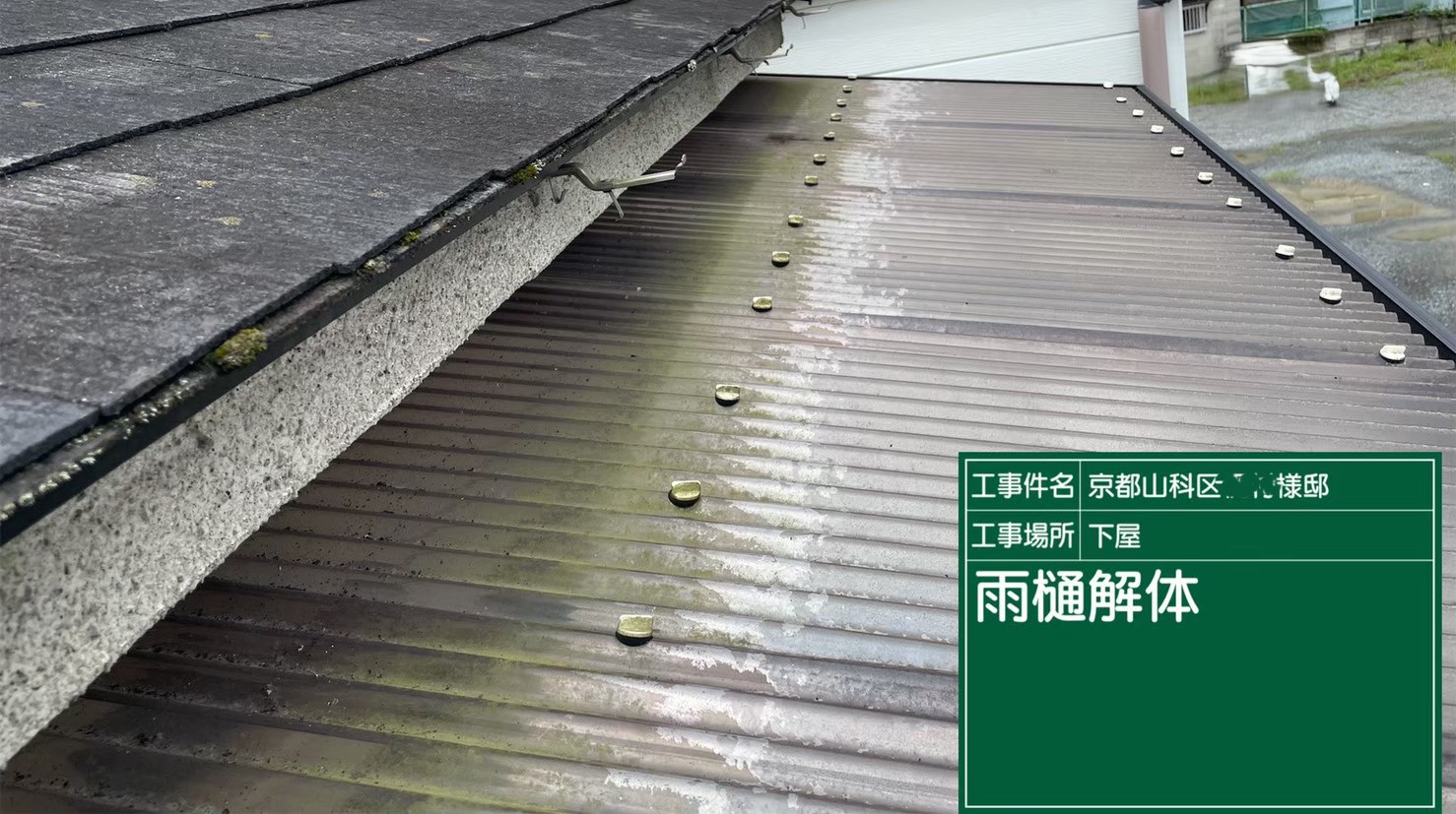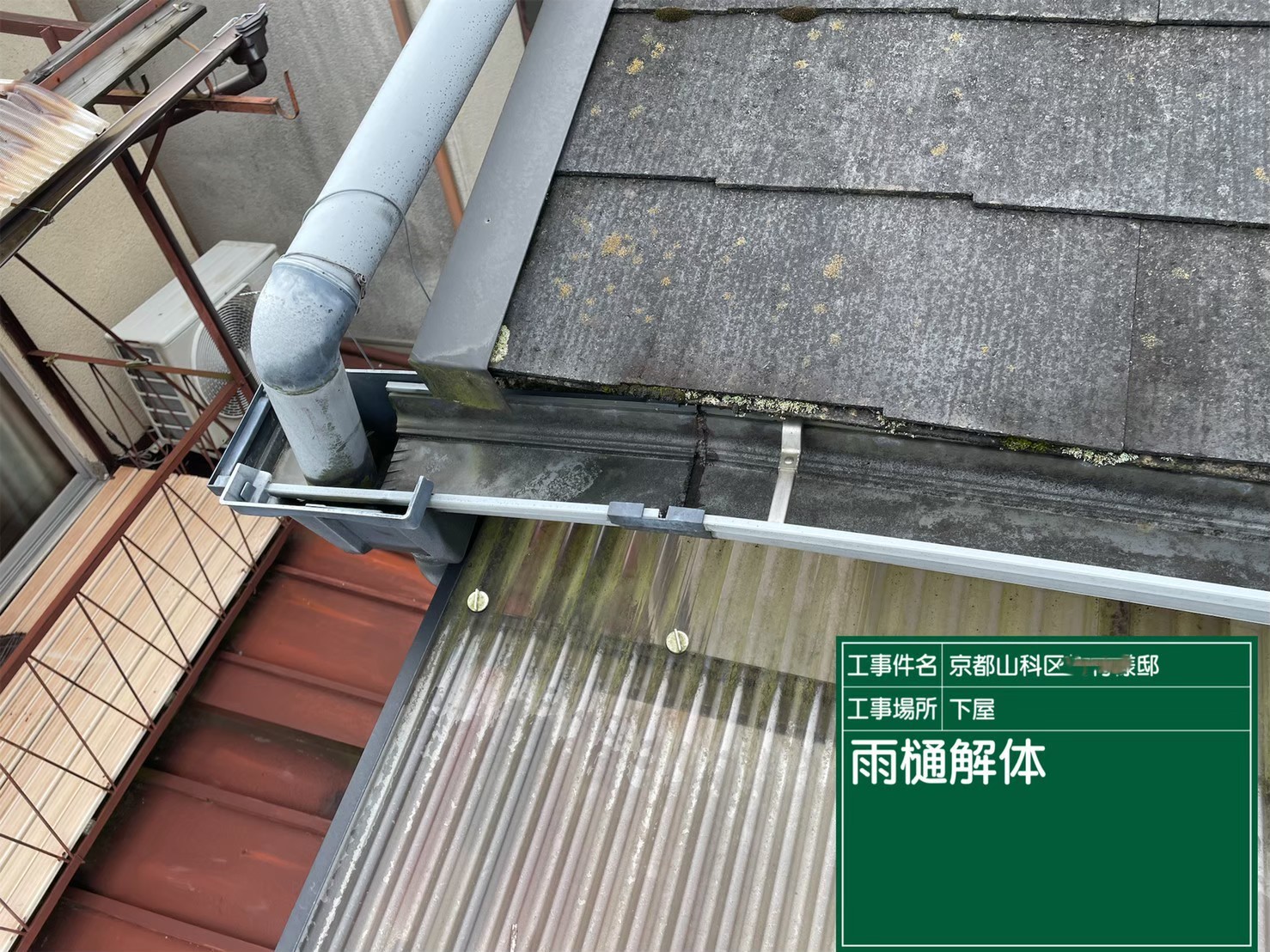 京都市山科区で、下屋の雨樋取り替えとテラスの波板張り替え工事を行いました。