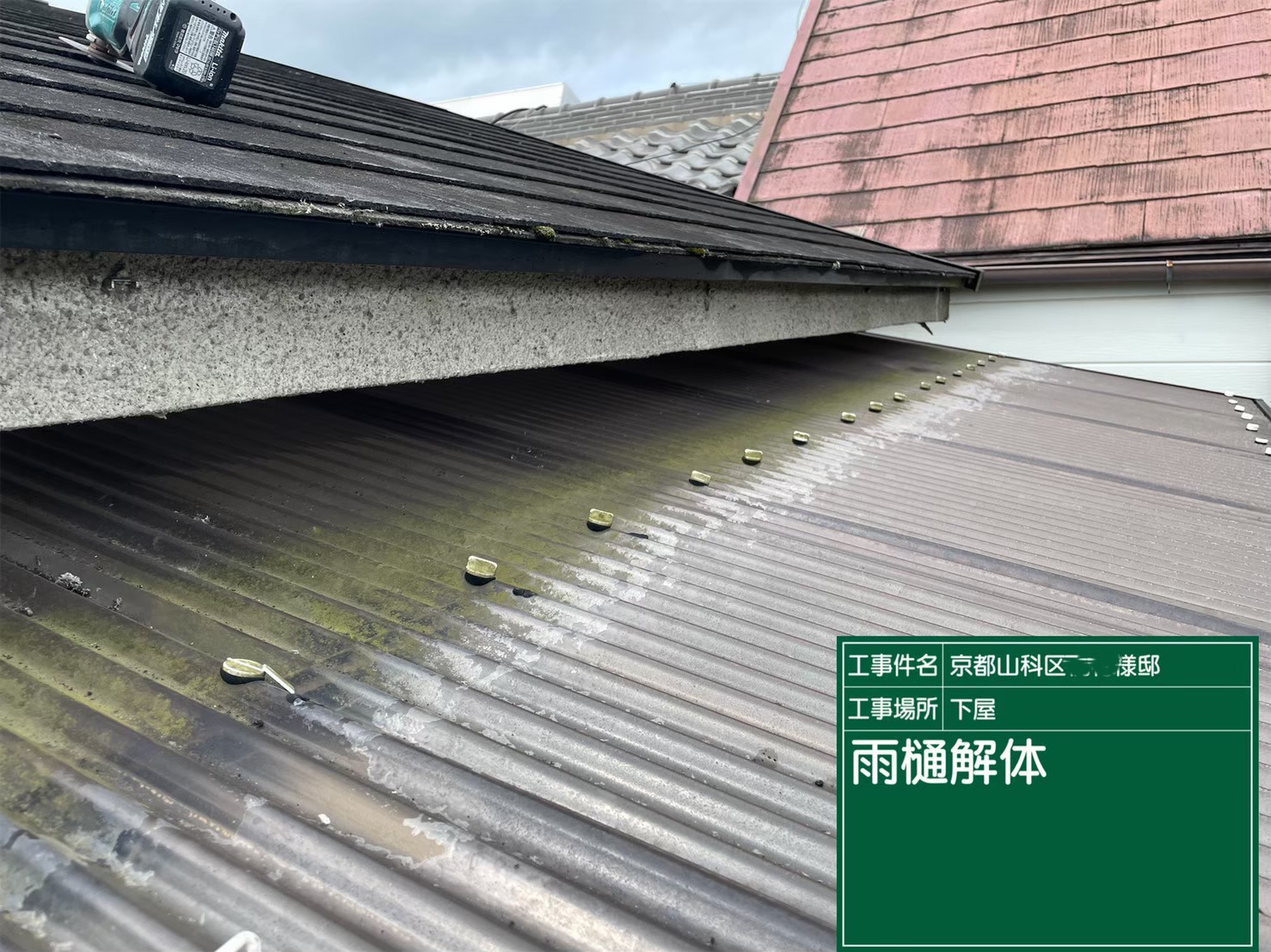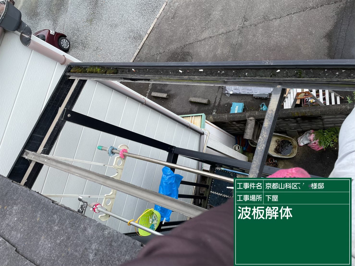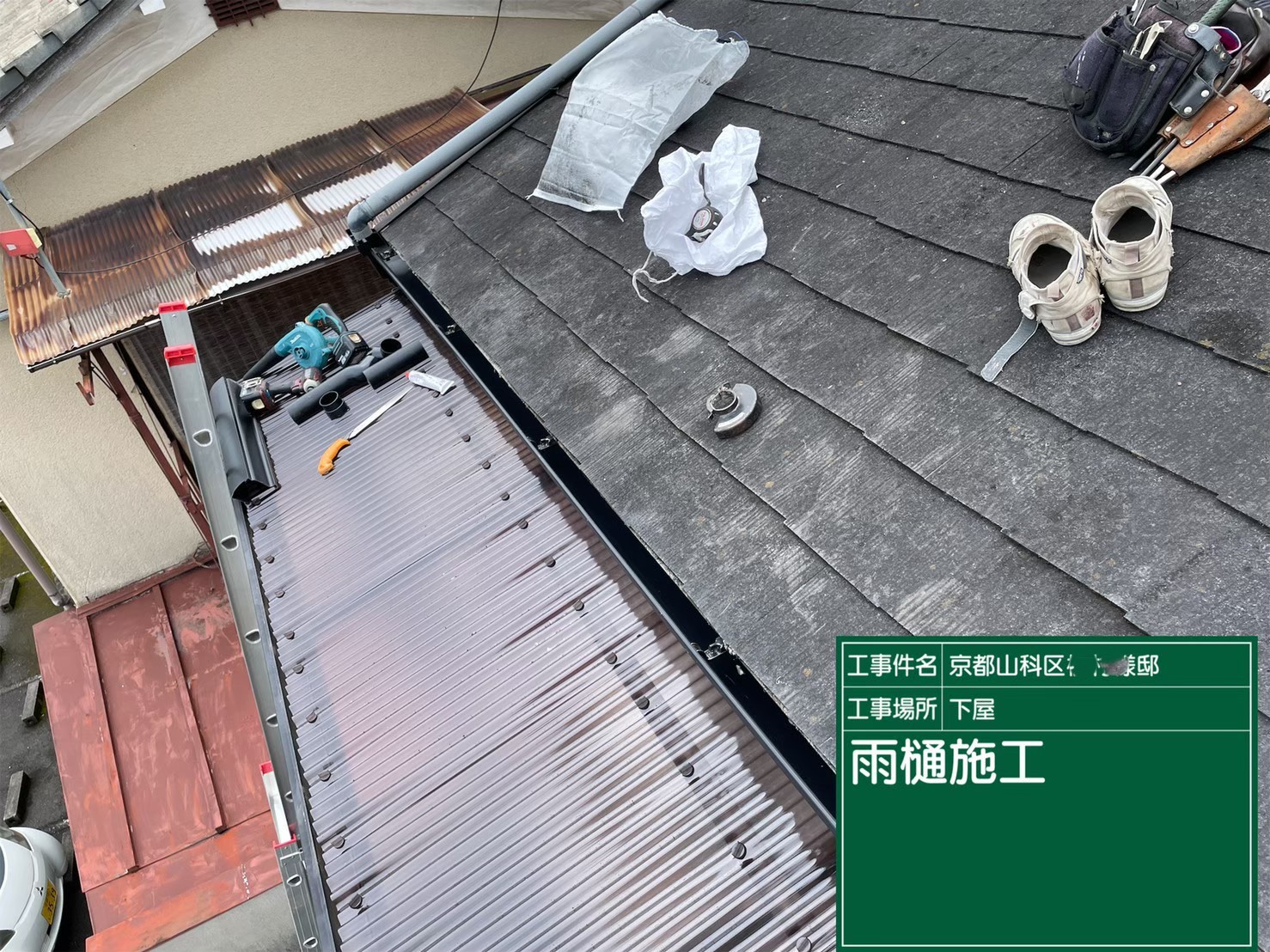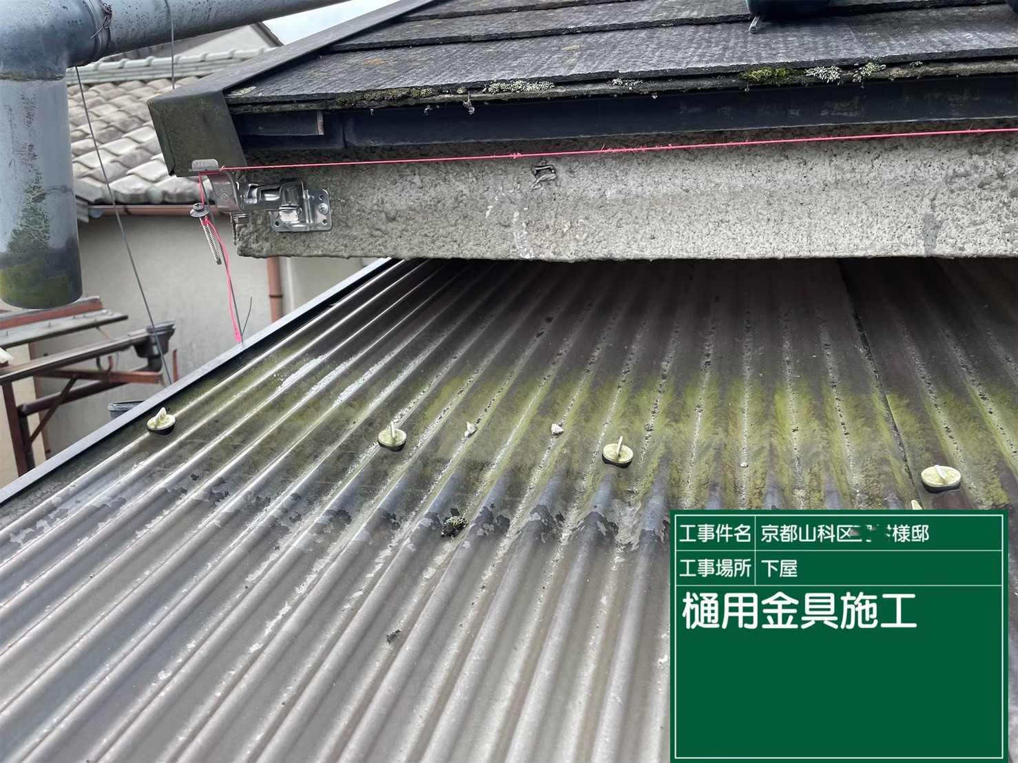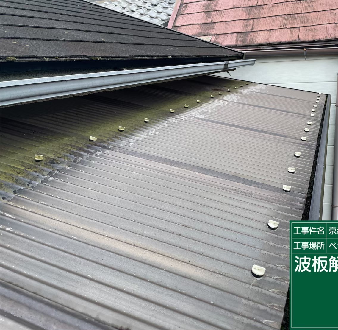 京都市山科区で、下屋の雨樋取り替えとテラスの波板張り替え工事を行いました。