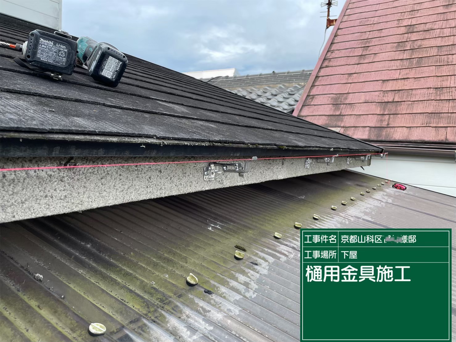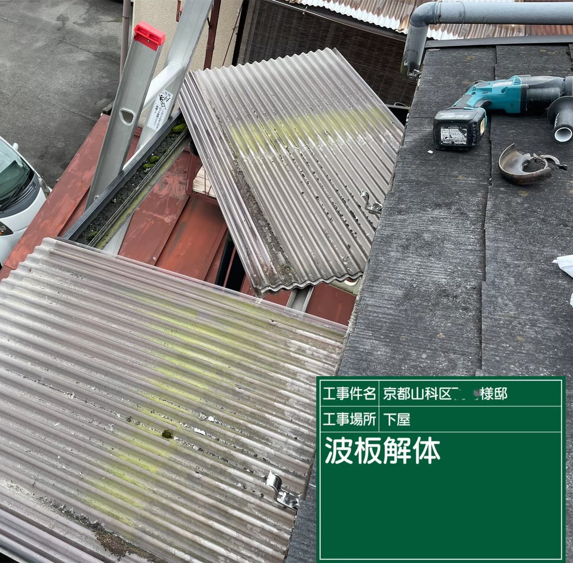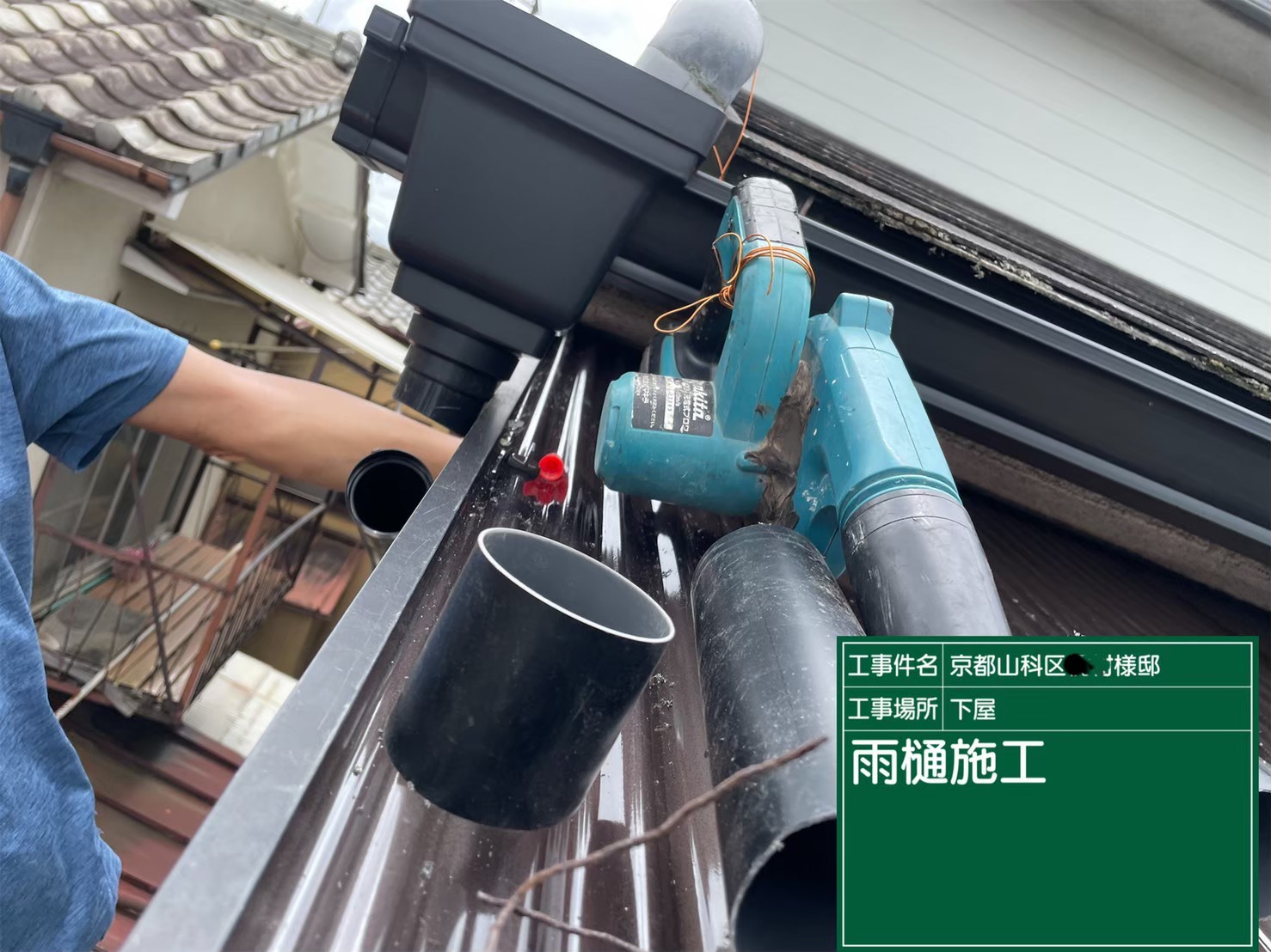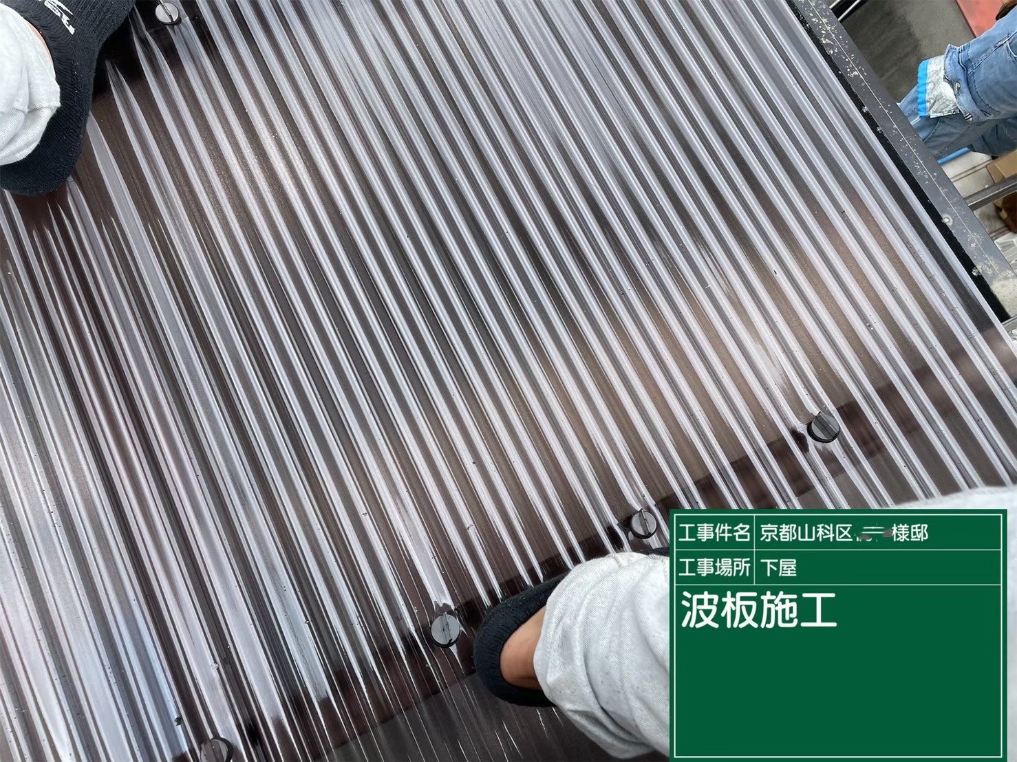 京都市山科区で、下屋の雨樋取り替えとテラスの波板張り替え工事を行いました。