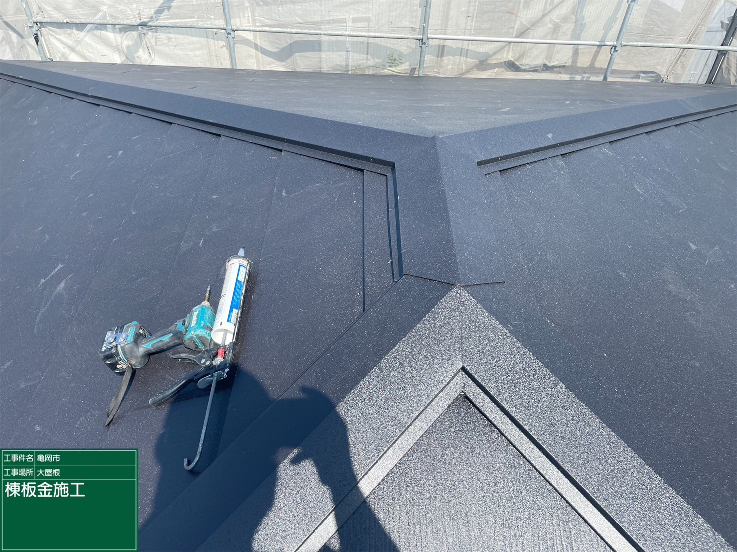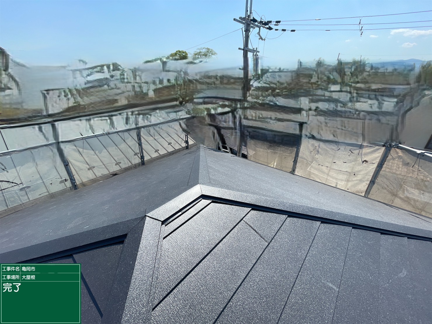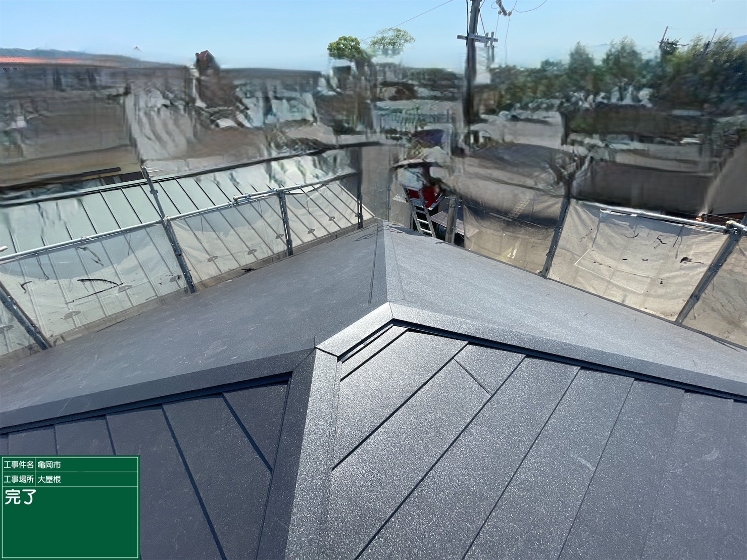 京都府亀岡市 屋根重ね葺き工事(カバー工法)寄棟捨て板金施工