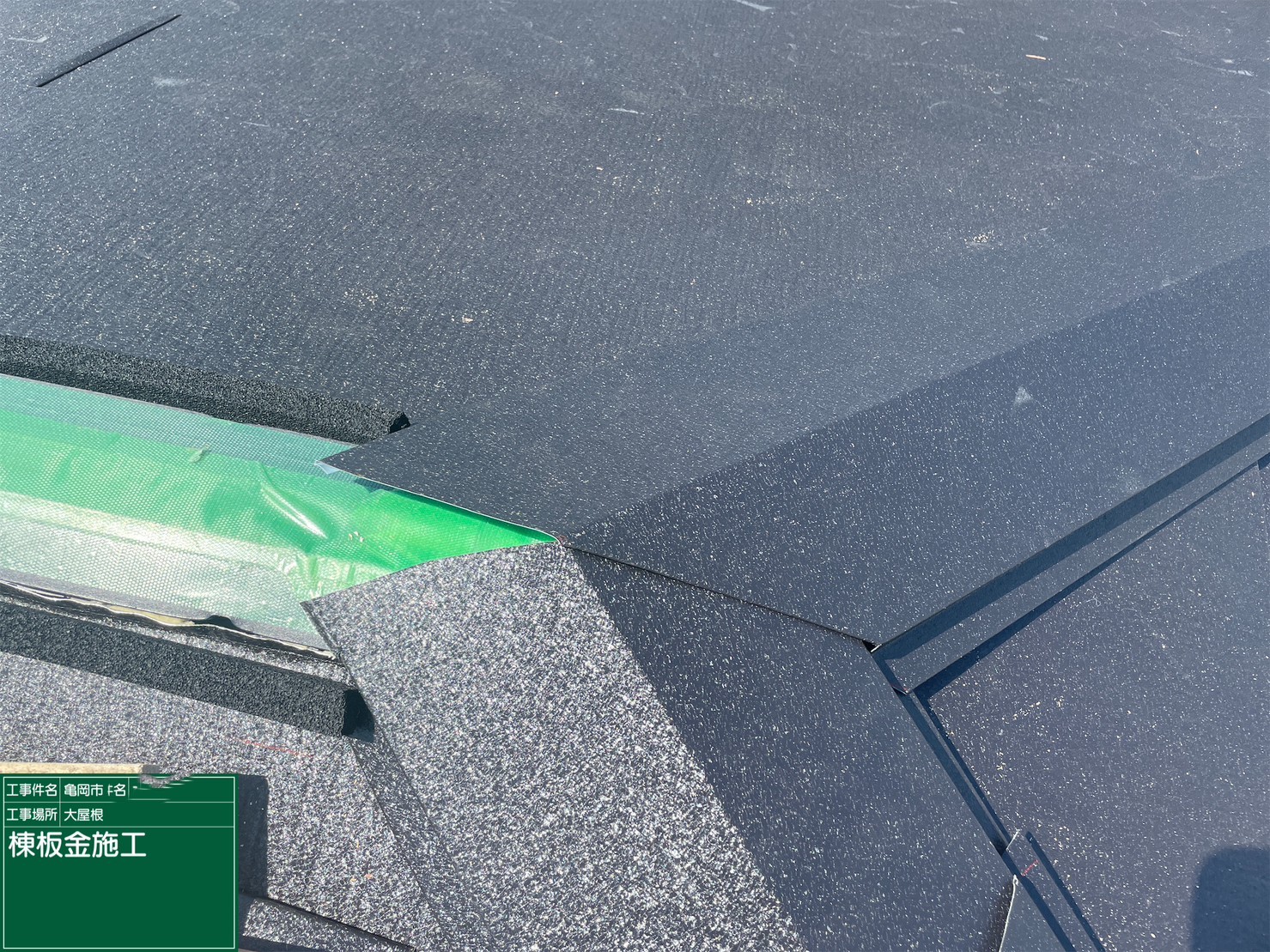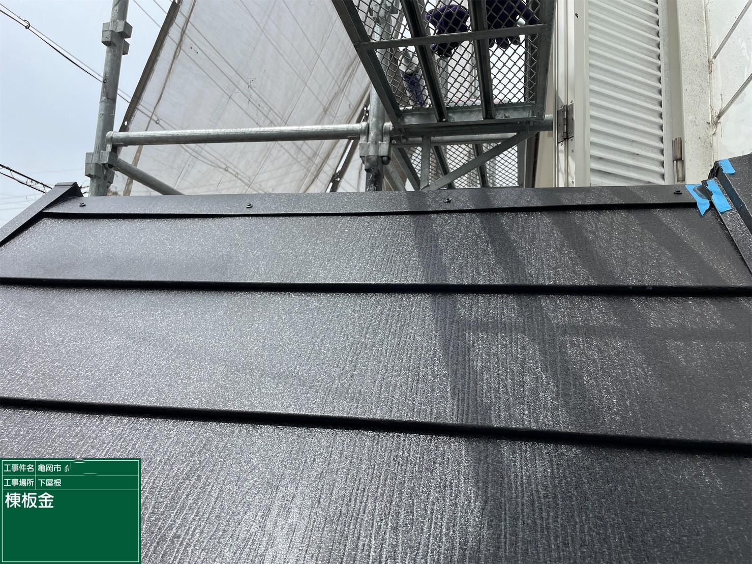 京都府亀岡市 屋根重ね葺き工事(カバー工法)下屋棟板金施工