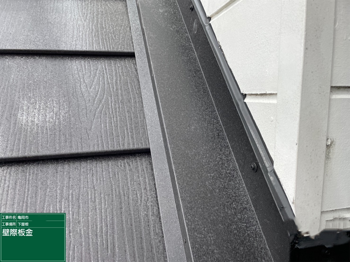 京都府亀岡市 屋根重ね葺き工事(カバー工法)壁際板金施工